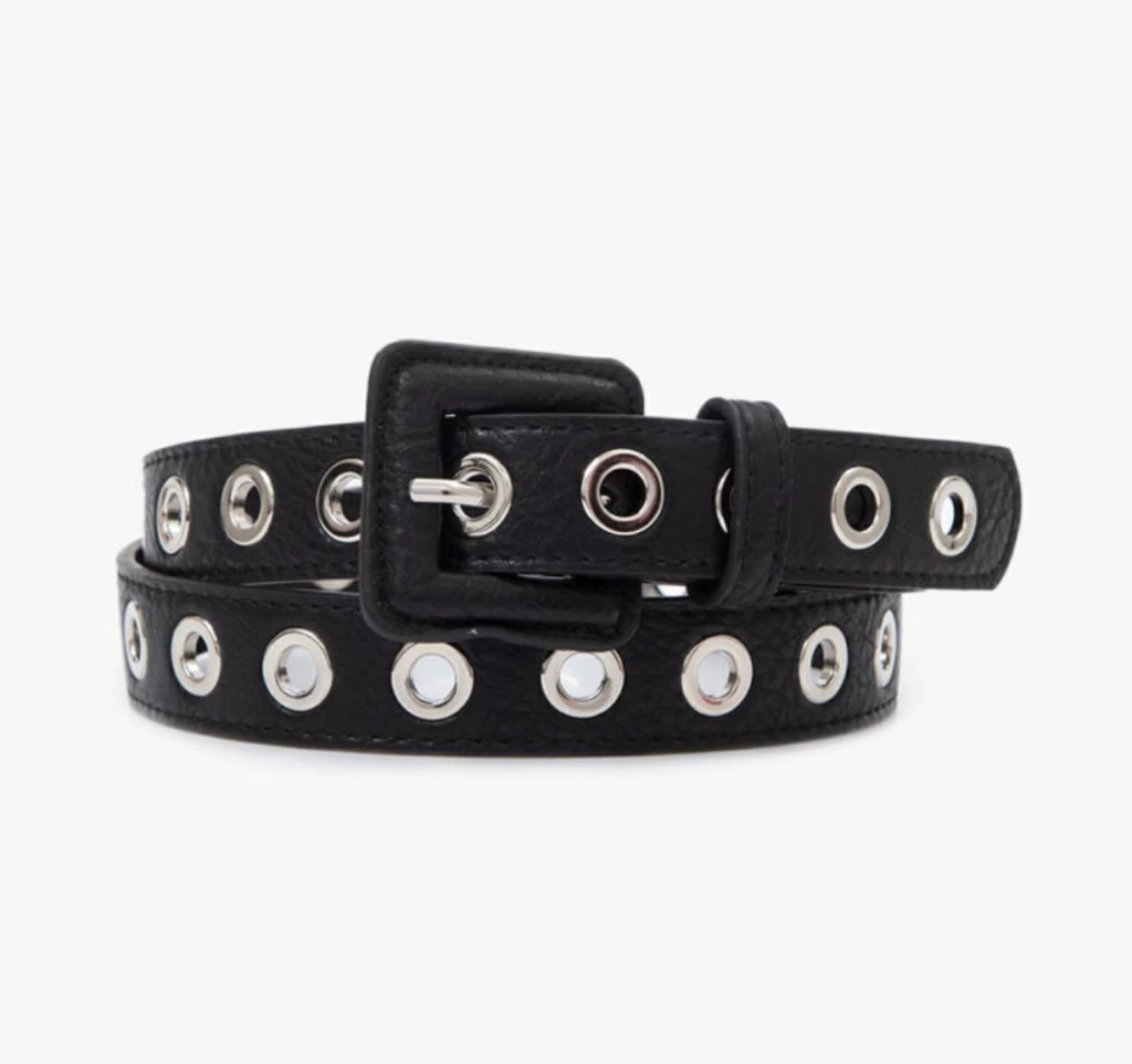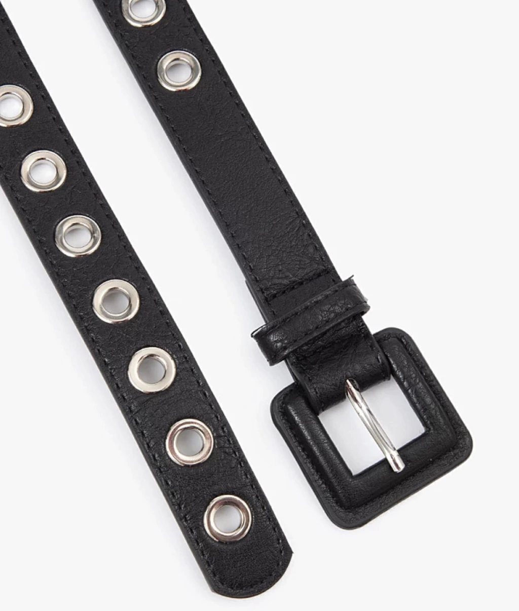 Cinto couro sintético, fivela na cor preta com detalhes de ilhóes