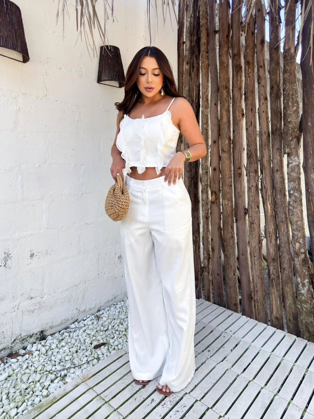 Conjunto Gabrielli, composto por duas peças, blusa com detalhes de babado frontal,calça com modelagem pantalona, garantido caimento impecável e liberdade de movimento.