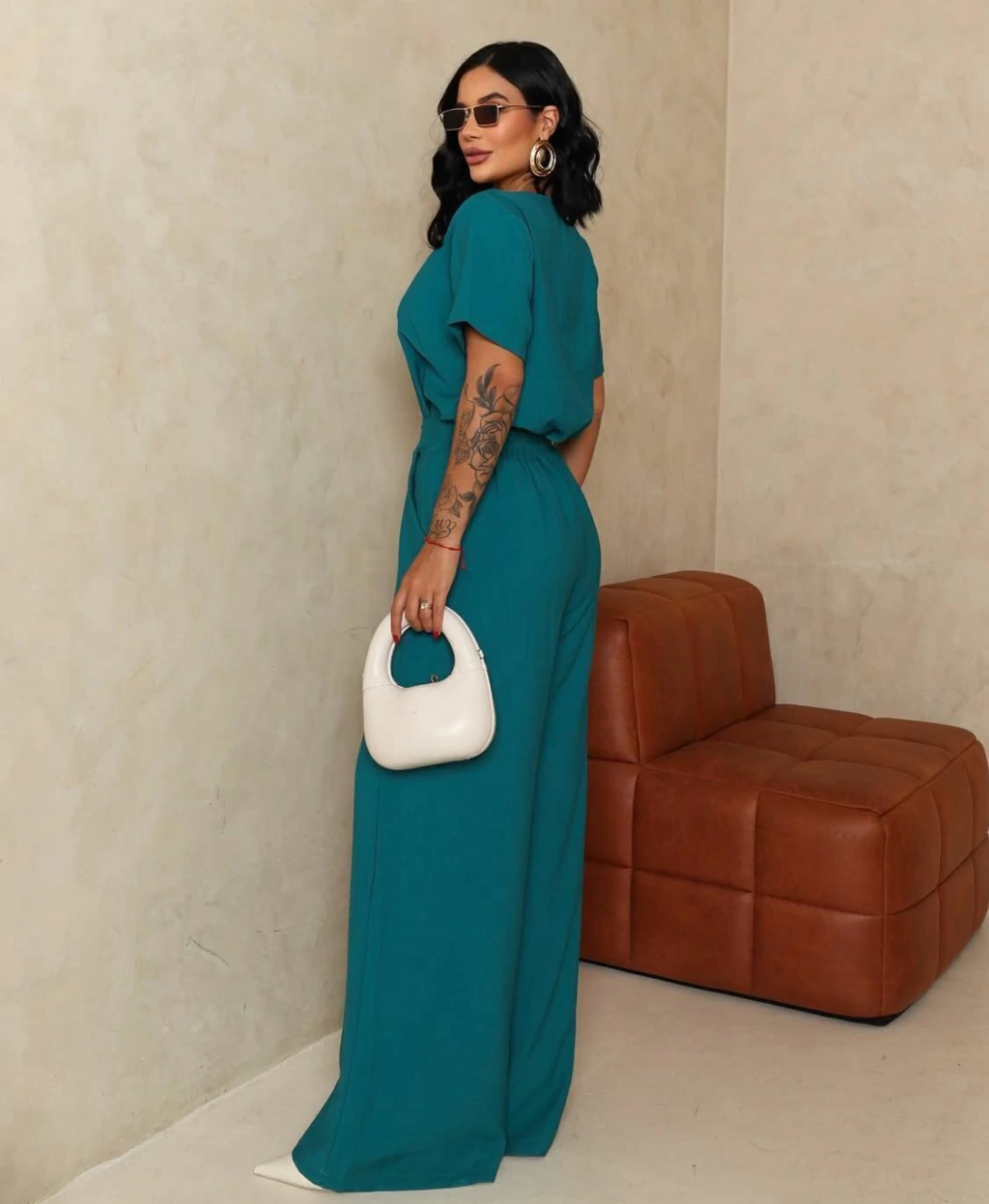Conjunto Mel,calça pantalona com cós reto, elastico na parte de trás.
