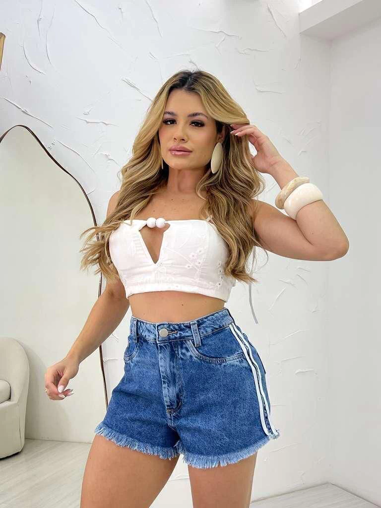 Short Jeans com detalhes em Listra na lateral e barra desfiada