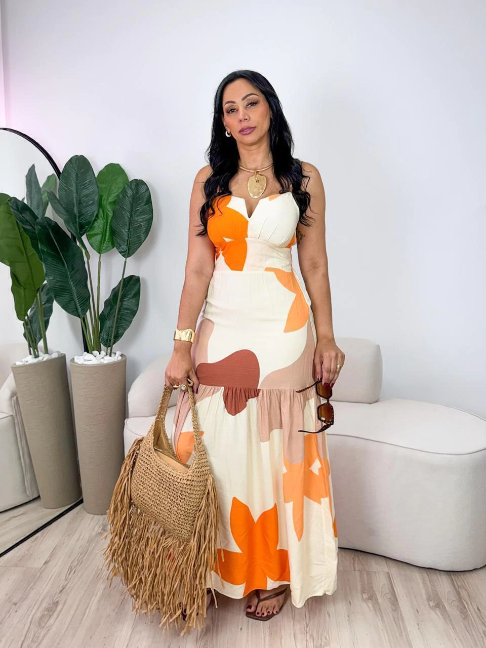 Vestido longo Decote v com bojo, com aro no busto, com alça regulavél, possui lastex nas costas.