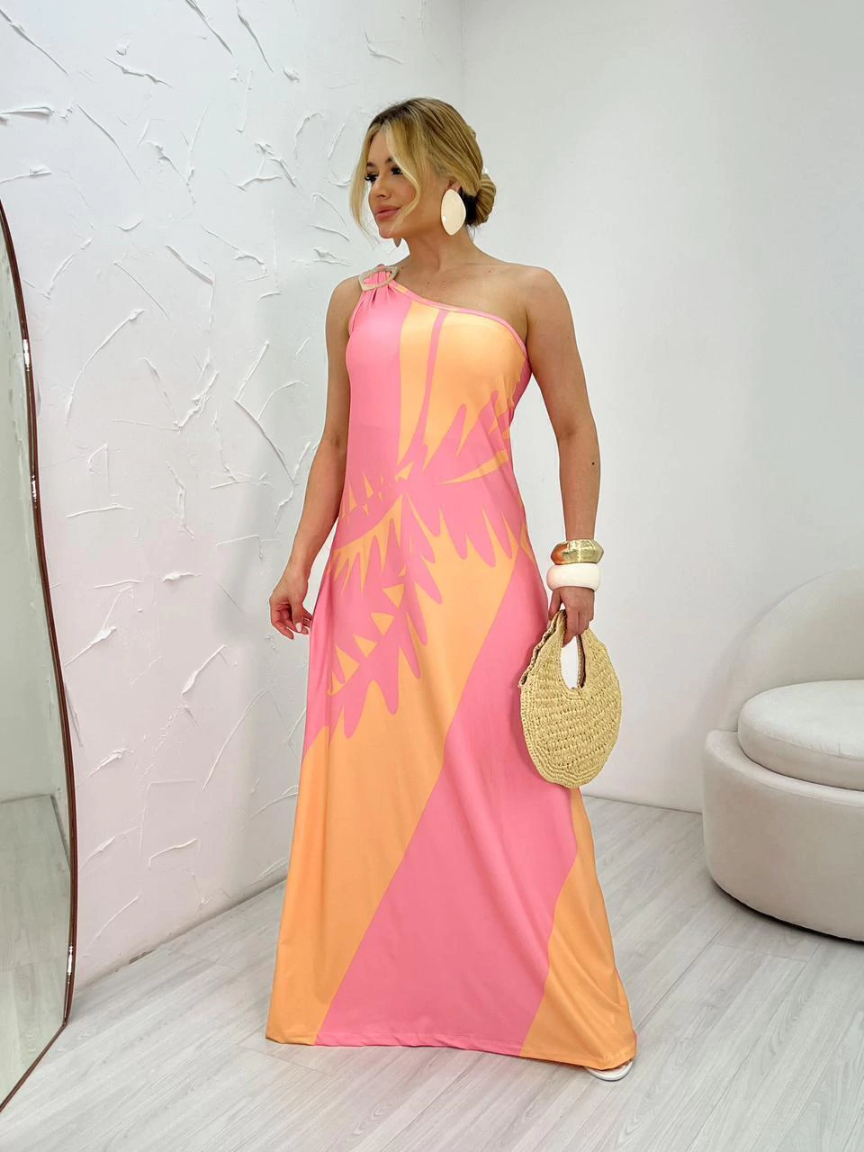 Vestido longo, de um ombro só com fivela, com bojo, super fluido.